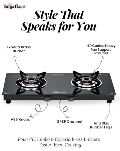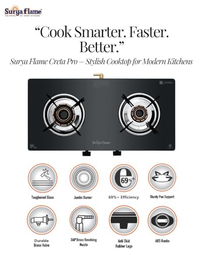 Specification: Surya Flame Creta Pro LPG 2 Burner Gas Stove | Experia Burners, Jumbo Burner, HR Coated Heavy Pan Support | Toughened Glass Top | Brass Revolving…