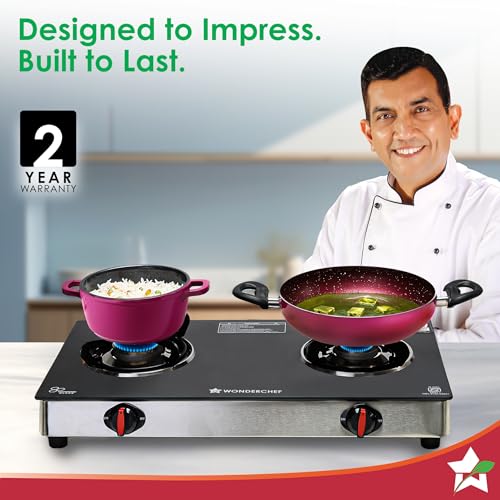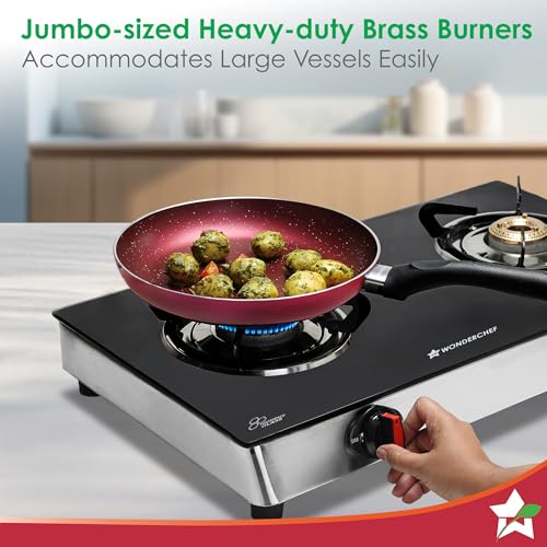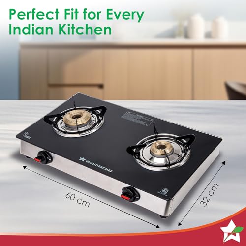Wonderchef Regal 2 Brass Burner Cooktop, LPG Gas Stove for Kitchen, ISI Toughened Glass Surface, SS Frame, Spill-Proof Design, Ergonomic Knobs,…