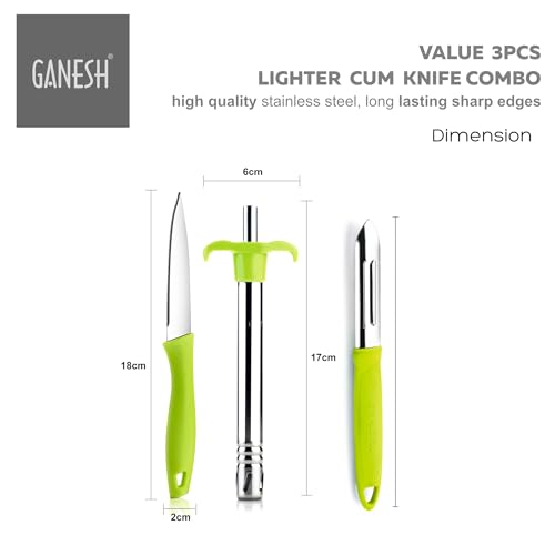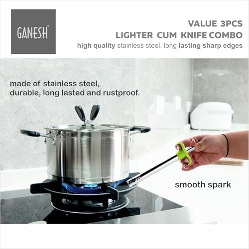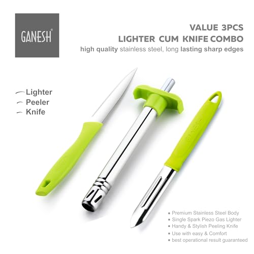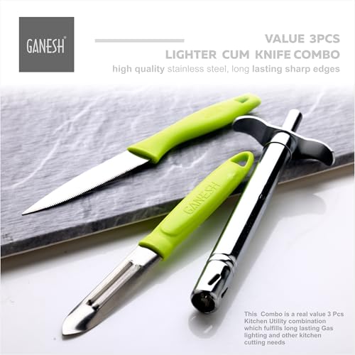 Ganesh Stainless Steel Gas Lighter with Knife & Peeler for Kitchen Use Restaurants Metal Gas Stove Lighter Regular Size Easy Grip, 3-Piece, Colour…