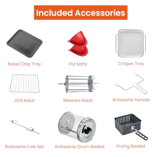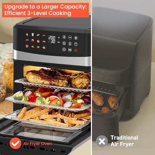 - Large Capacity: This 12L large-capacity fryer oven has convenient buttons and a clear LED display. You can easily operate and select different functions. At the same time, it also has lighting control that allows you to pass the glass panel can view the cooking progress of the internal food, which greatly increases your control over the food.