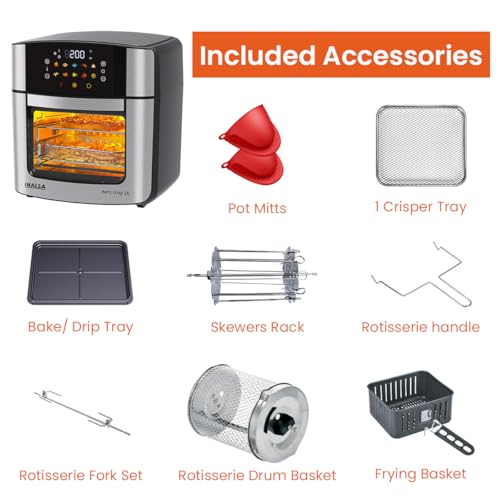 - Accessory Kit for Easy Cooking: Includes 1 Main Unit, 1 Pot Mitt, 1 Crisper Tray, 1 Skewers Rack, 1 Bake/Drip Tray, 1 Rotisserie Handle, 1 Rotisserie Fork Set, 1 Rotisserie Drum Basket, 1 Frying Basket with Handle, 1 Recipe Booklet, and 1 Instruction Manual cum Warranty Card.