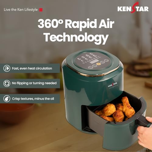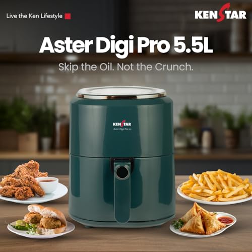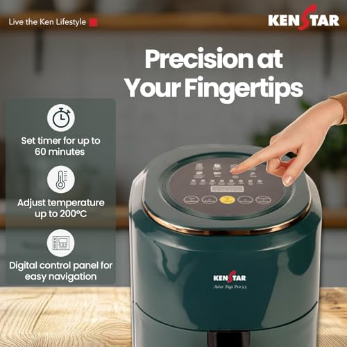 Kenstar ASTER PRO DIGI 5.5 Air Fryer | 360° High Speed Air Circulation Technology with Non-Stick 5.5 L Basket | 1400 W | Green,