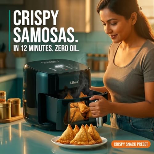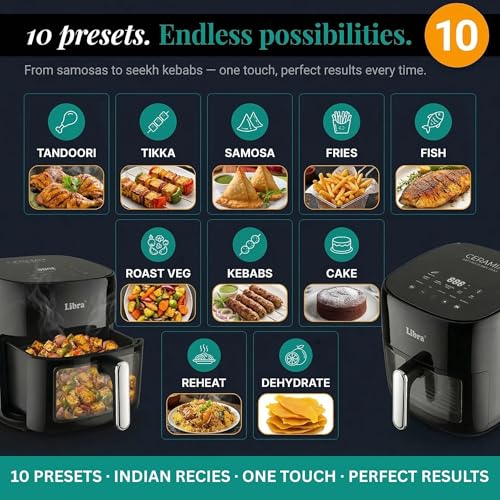 - 10 Presets Built for How Indians Actually Cook: Pre-programmed modes calibrated specifically for the Indian kitchen — Tikka & Kebab, Mathri & Namkeen, Paneer Dishes, Fish Fry, Tandoori Chicken, Biryani Prep, and more. No guessing. No adapting. Touch once. Eat perfectly.