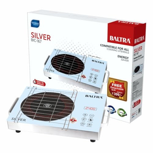8 reviews for BALTRA Infrared Induction Cooktop Radiant Silver 2400Watt Touch Control Panel | Over Heat Protection, Multi Power Level Function, Digital Display,…