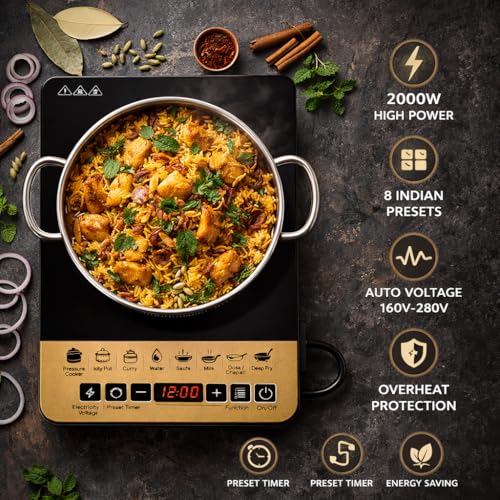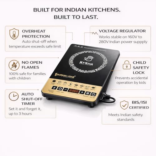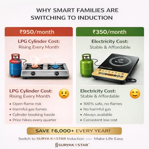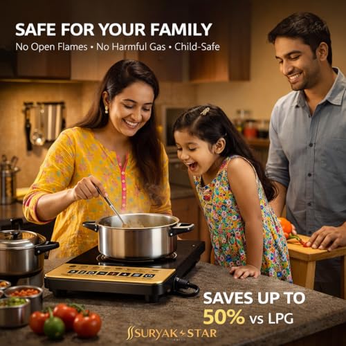 • COOK WITHOUT GAS WITH 2000W FAST HEATING: Upgrade to electric cooking with this 2000W induction cooktop that runs on a regular 230V/10A household plug. No LPG cylinder dependency, no refill delays, and no open flames. Ideal for everyday Indian cooking such as roti, dal, rice, sabzi, frying, boiling, and pressure cooking. A practical choice for homes, hostels, PGs, office pantries, and rental kitchens.