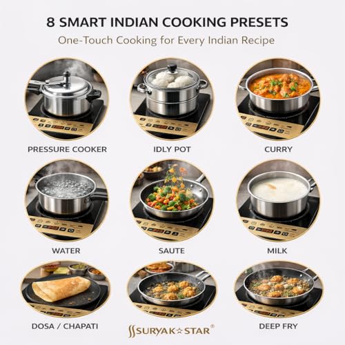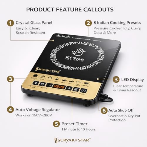 SURYA K Star 2000W Induction Cooktop for Home | Crystal Glass Top | 8 Indian Cooking Modes | Auto Shut-Off & Overheat Protection | LED Display |…