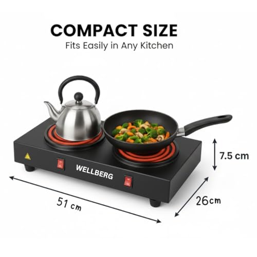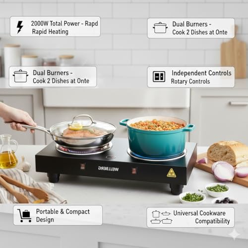 Wellberg Double Coil Cooktop 2000W Electric Hot Plate with Independent Control Switches, Durable Stainless Steel Heating, Dual Burner for Slow &…