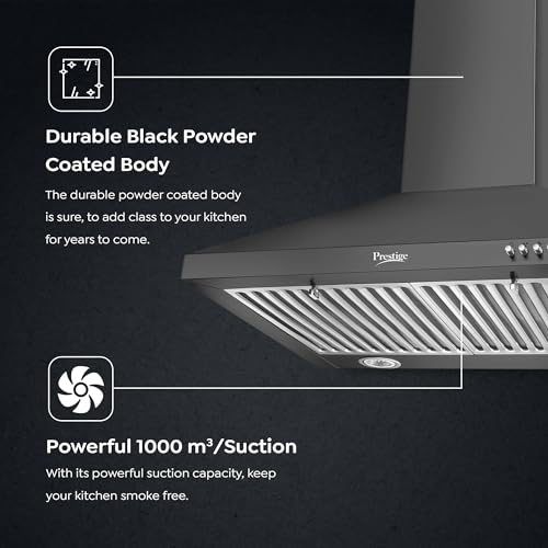 Specification: Prestige Dura Plus 600 Contemporary Black Kitchen Hood chimney|Powerful 1000M3/Suction|Easy Push Buttons With 3 Speed|Ss Baffle Filter