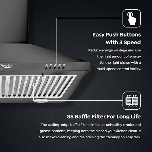 Durable Black Powder Coated Body- The Durable Powder Coated Body Is Sure, To Add Class To Your Kitchen For Years To Come, Easy Push Buttons With 3 Speed- Reduce Energy Wastage And Use The Right Amount Of Energy For The Right Dishes With A Multi-Speed Control Facility, Energy Efficient Led Lights- The Energy-Efficient, Leds Are Long Lasting And Provide Bright, High Lumen Led Lighting For Better Visibility At Night, Powerful 1000M3/Suction- With Its Suction Capacity, Keep Your Kitchen Smoke Free, Ss Baffle Filter For Long Life- The Cutting-Edge Baffle Filter Eliminates Unhealthy Smoke And Grease Particles, Keeping Both The Air And Your Kitchen Clean. It Also Makes Cleaning And Maintaining The Chimney An Easy Task